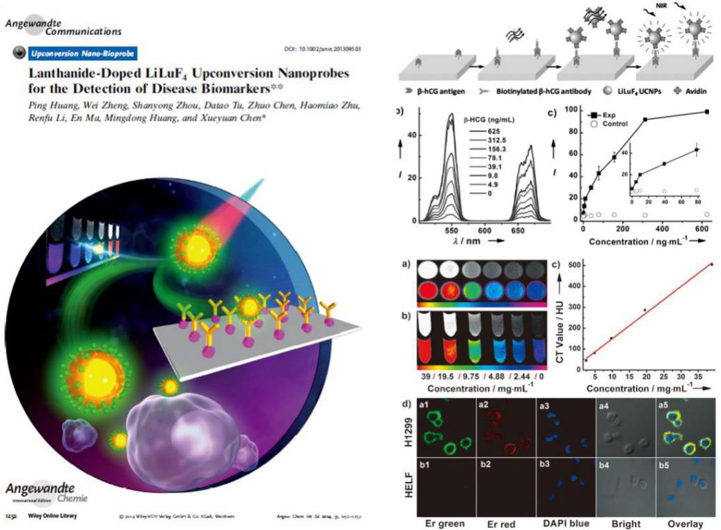 图3、多功能LiLuF4:Ln3+上转换纳米荧光探针用于肿瘤标志物检测与靶向成像 | |