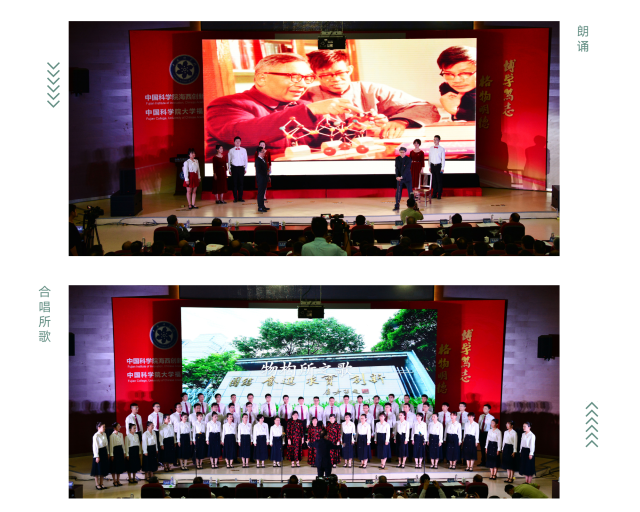退休职工和三地五所的在职职工、学生表演朗诵《心灯不灭 创新圆梦》、合唱所歌