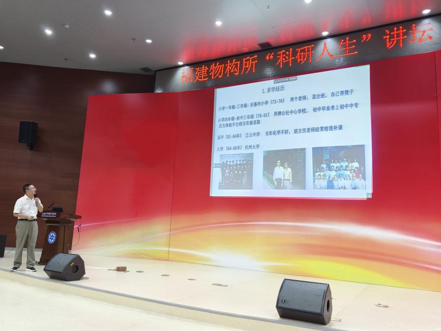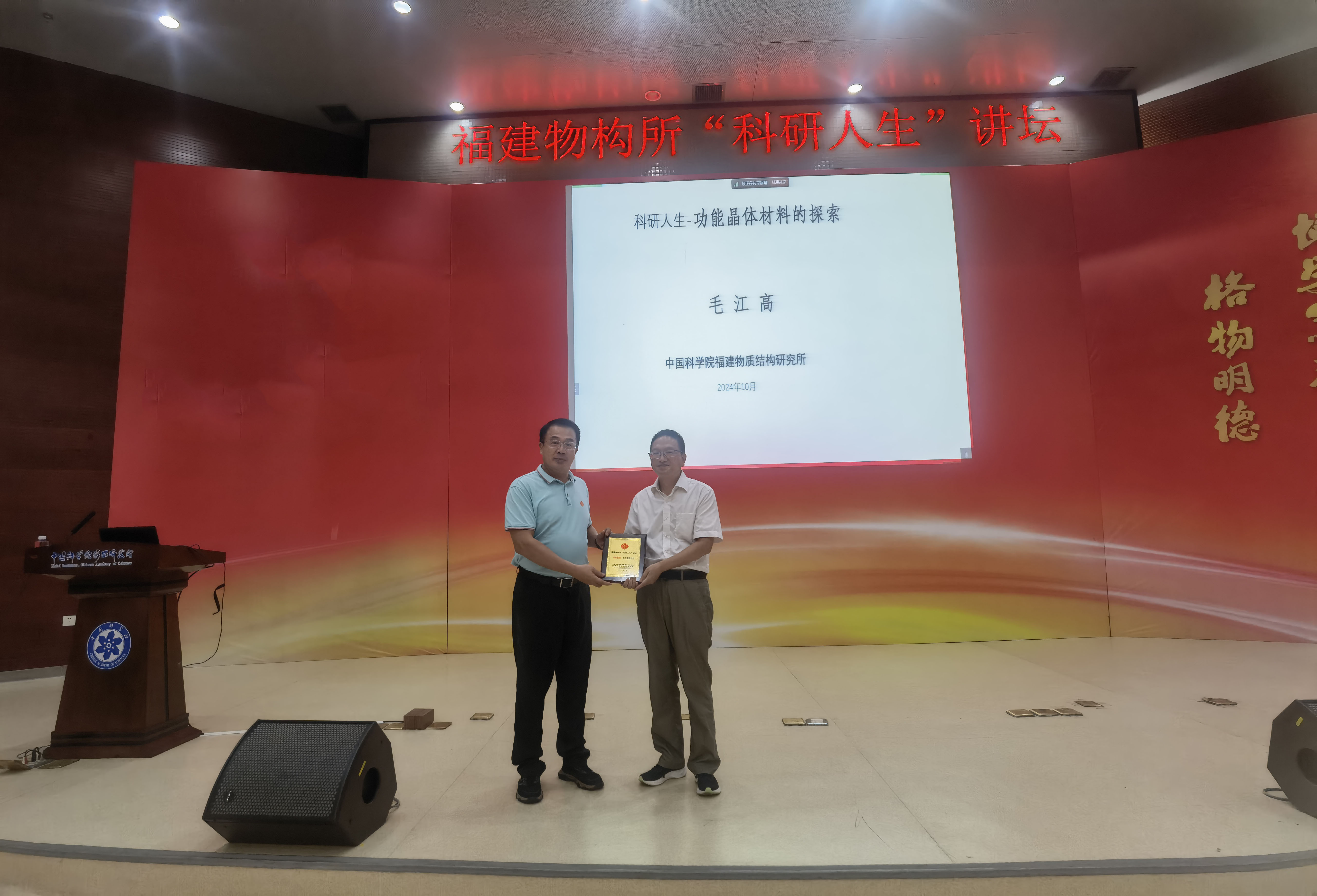 10月18日,福建物构所举办新一期“科研人生”讲坛,邀请毛江高研究员作为主讲嘉宾,分享其在功能晶体材料科研生涯中的人生体会。党委书记黄艺东主持讲坛,并为毛江高颁发了“科研人生”讲坛纪念牌。党员代表、科研骨干代表、研究生等在现场或以视频方式参加。