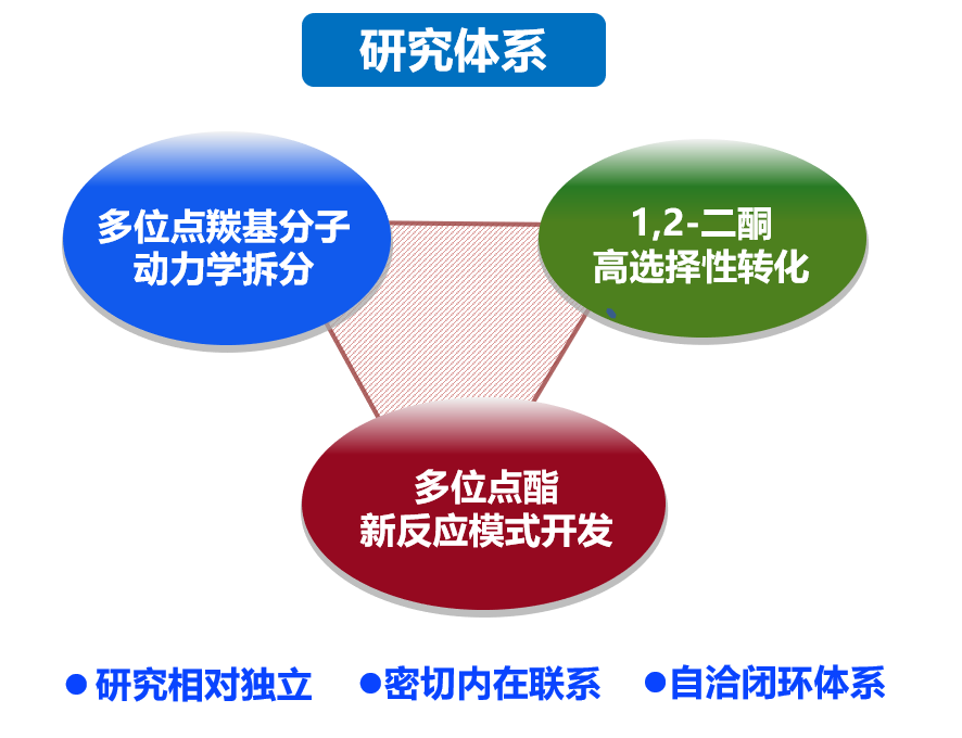 本课题组研究领域为不对称催化和药物合成,尤其以多位点羰基分子参与的催化转化为核心,先后开展了三个研究方向的工作:(1) 多位点酮类分子的动力学拆分;(2) 1,2-二酮的高选择性转化;(3) 多位点酯的新反应模式开发。我们注重经验规律的总结同时追求创新和突破,以方法普适性为重要特色,以解决不对称合成中的各类难点为重要目标,开发新反应、新策略、新研究领域,丰富有机化学的工具箱,不断拓展有机化学的边界。