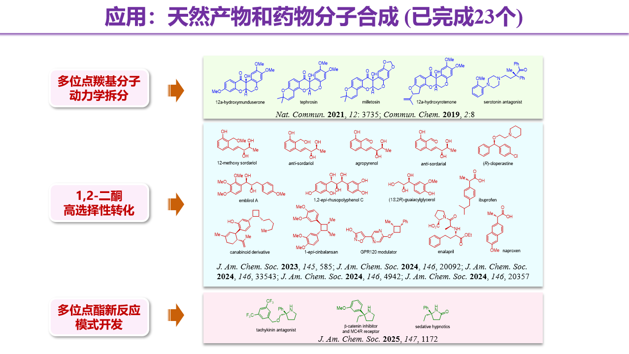 Our research group focuses on asymmetric catalysis and drug synthesis,with a particular emphasis on catalytic transformations involving multisite carbonyl molecules. We have sequentially developed three research directions: (1) kinetic resolution of multisite ketone molecules;(2) highly selective transformations of 1,2-dicarbonyl compounds;and (3) development of novel reaction modes for multisite esters. We prioritize the summarization of empirical regularities while pursuing innovation and breakthroughs. With a strong emphasis on methodological generality,we aim to address various challenges in asymmetric synthesis. By developing new reactions,strategies,and research domains,we strive to enrich the toolbox of organic chemistry and continually expand its boundaries.
