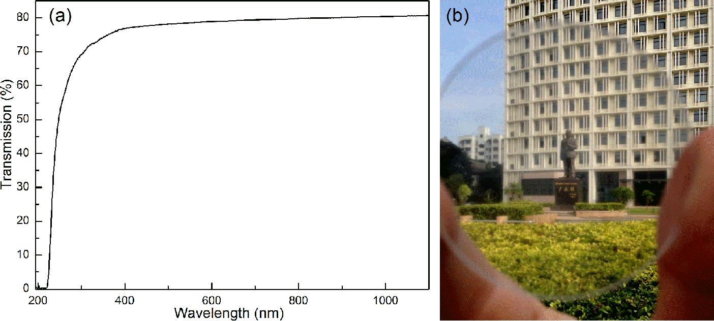 无压烧制透明陶瓷光透过率曲线(a)和室外照片(b)
