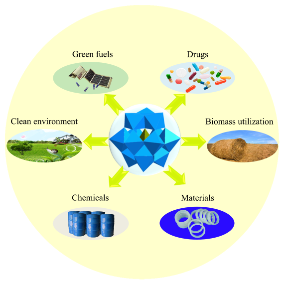 多金属氧酸盐因其结构丰富,性能独特,在药物化学、材料化学及催化科学等领域受到广泛关注。美国化学会《化学评论》和英国皇家化学会《化学会评论》分别于1998年和2012年的专刊(Chem. Rev., 1998, 98, 1–390; Chem. Soc. Rev., 2012, 41, 7325–7648)中综述了多金属氧酸盐的合成、结构、性质及应用,包括其在催化反应中的应用(Chem. Rev., 1998, 98, 113–170; Chem. Rev., 1998, 98, 171–198; Chem. Rev., 1998, 98, 199–217及Chem. Soc. Rev., 2012, 41, 7572–7589)。2014年,《化学评论》评述了多金属氧酸盐催化轻烷烃氧化反应(Chem. Rev., 2014, 114, 981–1019)。在上述综述文章中,除Chem. Soc. Rev. (2012, 41, 7572–7589)评述了近年兴起的研究热点之一—多酸催化产氧反应外,其余综述文章只评述了传统催化反应类型,即酸型反应和氧化型反应,对其它类型反应关注甚少。实际上多金属氧酸盐具有多重催化活性位点,不仅可催化酸型和氧化型反应,还可催化碱型和还原型反应。尤其重要的是,通过金属取代的方式对多金属氧酸盐进行改性,可催化其它多种类型的反应,如偶联反应、环丙化反应以及近年来备受关注的产氢/氧反应等。
