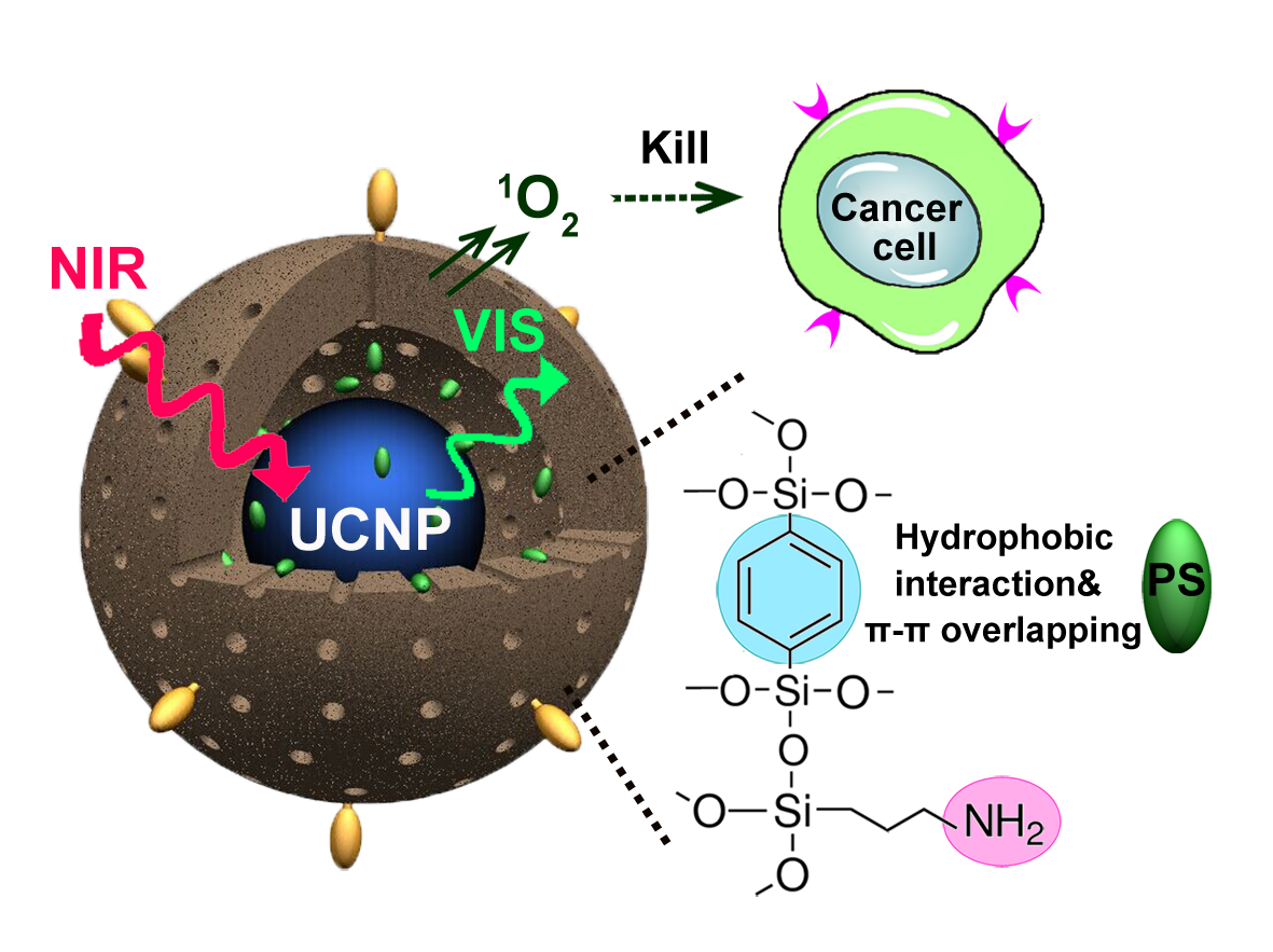 随着生物医学的发展,肿瘤诊断与治疗的多功能结合(简称诊疗)已成为新趋势。为了实现精确诊断和高效治疗,诊疗剂往往需兼具肿瘤靶向性、多模成像和治疗等各种功能。上转换纳米材料在近红外光照射下发出可见光,可应用于生物成像,又能够激发其负载的光敏剂产生单线态氧进行光动力治疗,因此在发展非侵入性诊疗剂上具有重要应用前景。然而,目前此类上转换诊疗材料的光敏剂负载量低、易团聚猝灭,而且上转换纳米颗粒和光敏剂间的能量传递效率较低,这些问题已成为上转换纳米光敏剂在光动力学治疗的应用瓶颈。