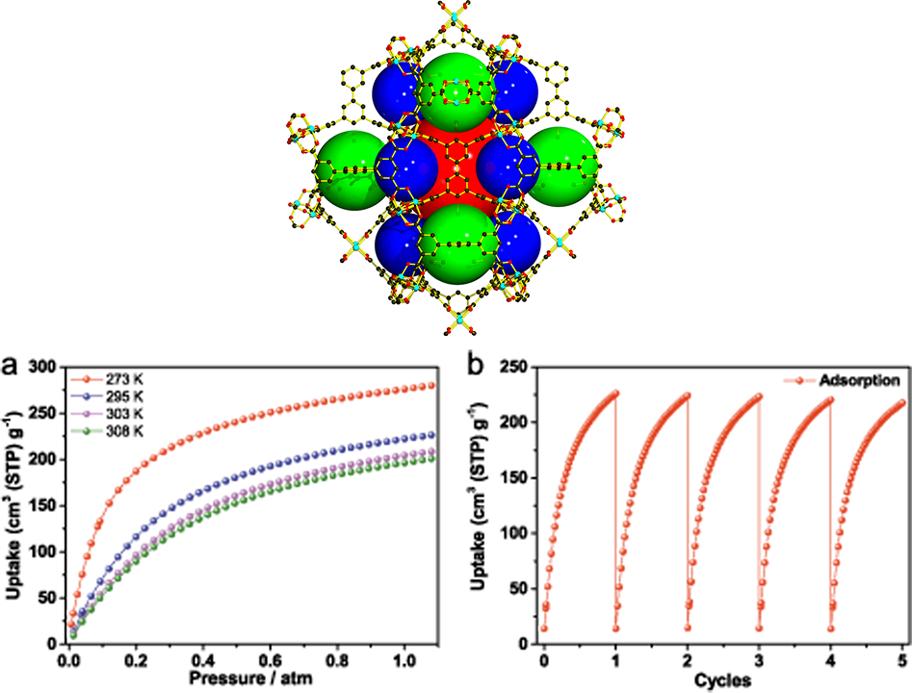 在科技部973计划、国家和福建省自然科学基金的资助下,福建物构所结构化学国家重点实验室洪茂椿院士课题组和袁大强研究员课题组通过自主设计合成树枝状的多羧酸配体,并选用金属铜离子为节点,自组装得到一例稳定的多孔MOFs化合物FJI-H8。完全活化的FJI-H8材料的比表面积为2025±15m2 g-1,孔径分布集中在1.2nm左右的狭小范围内;由于同时具有尺寸合适的孔道和丰富的开放金属位点,FJI-H8在室温常压条件下对乙炔显示了很好的吸附性能,在295K和一个大气压条件下,FJI-H8对乙炔气体的吸附量高达224cm3g-1,远大于此前文献报道的最大值(HKUST-1,201cm3 g-1)。即使在实验温度升高到308K时,乙炔吸附量仍能达到200 cm3 g-1。此外,在未经再次活化的情况下进行五轮吸脱附循环测试后,FJI-H8对乙炔的吸附量仅仅降低了3.8%,说明该材料具有很好的可重复利用性。理论计算表明,在FJI-H8超高的乙炔吸附性能中,不仅是开放金属位点,孔道的合适尺寸和几何构型也起到了至关重要的作用。该结果为具有优异乙炔吸附性能的多孔材料研究提供了新的思路和途径。上述研究工作发表在《自然通讯》上(Nat. Commun.,2015, 6, 7575, DOI: 10.1038/ncomms8575)。