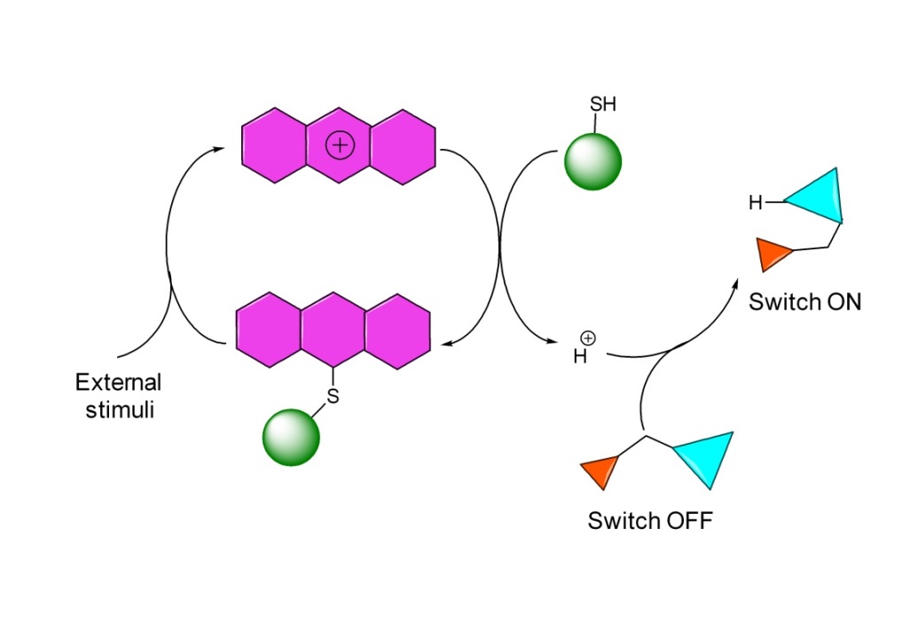 在国家自然科学基金资助下,结构化学国家重点实验室尤磊课题组首次采用动态共价化学与分子开关偶联的方法实现了信号的动态级联,并采用一系列的外界刺激对该体系进行了有效的调节。通过合理设计,发现了一个基于10-甲基吖啶盐和硫醇的新型动态共轭加成反应,所产生的产物酸性较之反应物增强了约10个数量级,并可通过调节酸碱性、改变组分、引入氧化剂等多种手段对该体系进行调控。在此基础上,成功使用该可逆共价反应所产生质子对一种构型开关和一种荧光开关实现可逆切换,深入探究了系统内化学组分以及平衡的作用机制,并引入另一个可逆共价反应实现动态级联体系的可逆抑制,从而进一步提高了系统复杂性。该工作为用于模拟生物系统的智能动态化学级联体系的发现与调控提供了一种新思路。相关研究成果发表在《美国化学会志》 (J. Am. Chem. Soc. 2015,DOI: 10.1021/jacs.5b09912)。