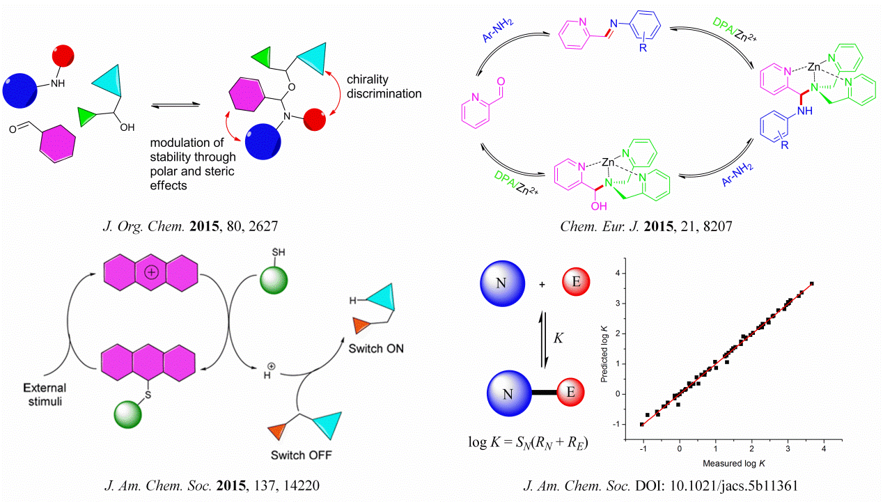 在上述“基于反应性的动态共价化学”导向的新型可逆共价作用的发现、调控及功能化研究基础上,该课题组提出了“用于动态共价化学和系统化学的定量反应性标度”(quantitative reactivity scales for dynamic covalent and systems chemistry)的新概念。有机化合物结构和反应性的关系是贯穿有机化学研究的核心,然而大家耳熟能详的反应性标度都是基于反应动力学的,建立有机化合物热力学反应性标度不仅能填补有机平衡体系反应性定量化的空白,还将与已成熟的动力学反应性标度相辅相成。该课题组以吡啶-2-甲醛和芳香伯胺原位生成亚胺,实现了其和醇、硫醇、伯胺、仲胺等常用亲核试剂的普适性动态共价反应,并通过取代基效应调控平衡。对于环状仲胺,由于供电子和吸电子取代基分别对亚胺和产物的稳定性有显著影响,产生独特的“跳跳板效应”,这也是首次在热力学控制体系中观察到这一现象。以所发现的可逆反应为基准,成功建立了统一的热力学定量反应性标度,并通过其它可逆反应证实了该标度的普适性和预测性,上述成果发表在J. Am. Chem. Soc.(DOI: 10.1021/jacs.5b11361)。