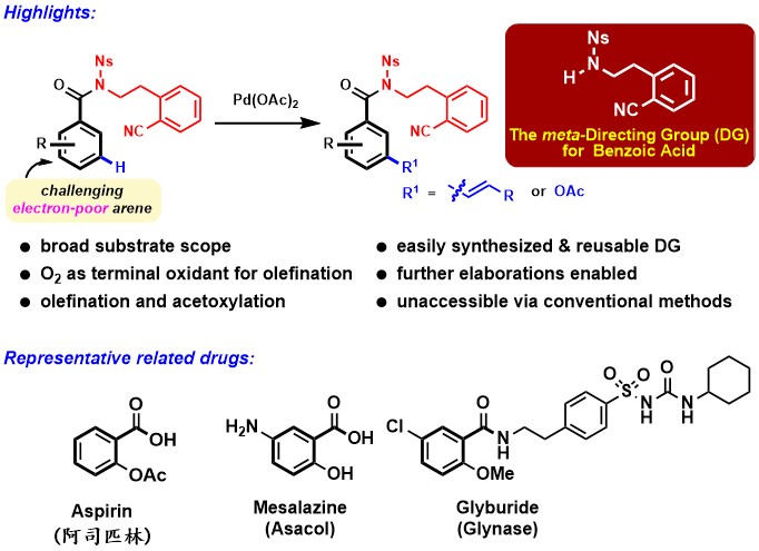 在以上研究基础上,该研究团队经过对具有导向作用的氰基官能团的位置调控,成功实现了具有重要实用价值的苯甲酸类化合物的间位选择性碳氢键活化(图2)。苯甲酸类衍生物在天然产物和药物分子中广泛存在,使用金属催化的碳氢活化方法在苯甲酸芳环上进行直接的官能团转化,可以大大提高此类化合物的合成和衍生化效率。然而由于苯甲酸芳香环的缺电子的性质,该类反应物的直接间位碳氢键官能团化反应往往比较困难,通常需要非常苛刻的条件。以往金属催化的直接官能团化的成功例子也几乎全部集中在苯甲酸及其衍生物邻位(ortho)碳氢键活化上,对于苯甲酸及其衍生物间位(meta)碳氢键的直接官能团化反应,在该项研究之前一直没有找到较为通用且条件温和的方法。该研究团队在国际上首次设计出了一种能促进金属钯活化苯甲酸衍生物的间位碳氢键的导向辅助基团(Directing Group),实现了苯甲酸间位碳氢键的直接烯烃化、氧化和后续一系列的各种官能团化衍生化反应。该反应具有广泛的底物适用范围,而且在烯烃化中可以使用氧气做为反应的氧化剂,避免了以往类似反应中使用昂贵的银盐作为氧化剂的缺点。此项研究为苯甲酸等芳香化合物的其他间位官能团化反应的研究提高重要的基础和思路,对于具有生物活性的天然产物高效合成和药物的高效研发都具有非常重要的实用价值。上述研究成果发表在《自然·通讯》上(Nat. Commun.2016, 7, 10443. DOI: 10.1038/ncomms10443)。