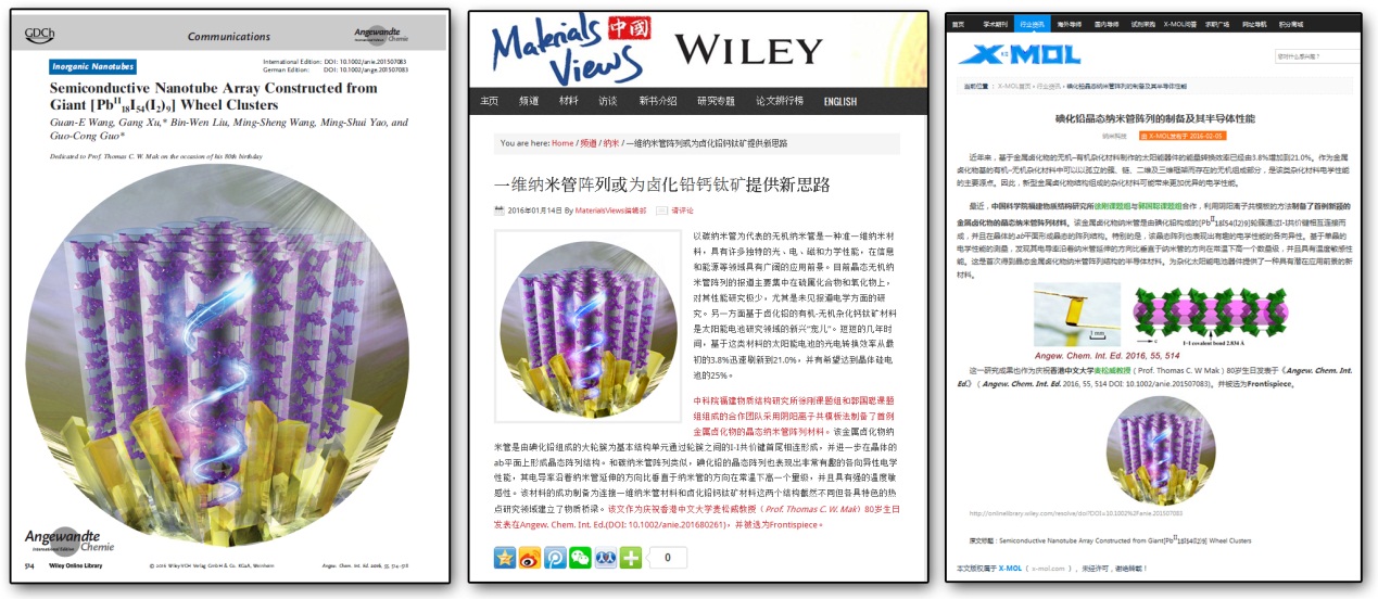 随后,受碳纳米管结构的启发,该攻关团队合成了由[PbII18I54(I2)9]大轮簇通过I-I共价键构成的金属卤化物纳米管晶态阵列结构。已有报道的轮簇主要是V、Mo、Cr、W、Nb等金属的配合物框架或者多酸类化合物,但以金属卤化物构成的轮簇,这是首例报道。研究发现其电导率沿着纳米管延伸的方向比垂直于纳米管的方向在常温下高一个量级,并且具有强的温度敏感性。该材料的成功制备为连接一维纳米管材料和卤化铅钙钛矿材料这两个结构截然不同但各具特色的热点研究领域建立了物质桥梁。相关研究结果发表在Angew. Chem. Int. Ed.2016, 55, 514,并被选为该期刊的Frontispiece。以上2项工作被Materials Views,X-Mol等新闻媒体以“一维纳米管阵列或为卤化铅钙钛矿提供新思路”等为题报道。