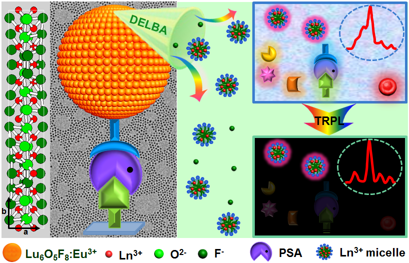 (基于超小稀土氟氧化物纳米荧光探针的前列腺特异性抗原体外检测原理示意图)