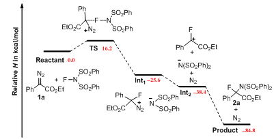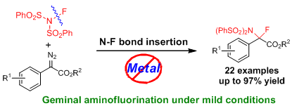 在国家自然科学基金青年项目的资助下,福建物构所中科院煤制乙二醇及相关技术重点实验室黄学良研究员课题组发现了首例重氮乙酸酯对N-F键的插入反应。通过N-氟代双苯磺酰胺与重氮酯反应,首次实现了在酯基α位碳原子上同时引入氟与氮两个特殊官能团。在机理研究方面,黄学良研究员课题组还与结构化学国家重点实验室李春森研究员课题组合作,进行了详细的动力学以及理论计算研究,阐明了C-F键和C-N键的形成机理。该反应无需金属催化剂、条件温和、反应效率以及原子经济性都很高,为合成α-氟代-α-氨基酸衍生物提供了一条高效简洁的路线。相关研究成果发表在国际权威期刊Chemical Science上(Chem. Sci. 2016, 7, 1786–1790)。