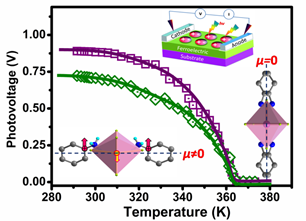 福建物构所结构化学国家重点实验室和中科院光电材料化学与物理重点实验室罗军华研究员领导的无机光电功能晶体材料研究团队,在国家杰出青年基金孙志华研究员主持的“春苗人才”专项和福建省杰出青年基金等项目资助下,提出了固体相变对称性破缺诱导极化效应的策略,构筑了系列新颖的极性光电功能晶体材料。最近,该团队立足于固体相变对称性破缺诱导极化效应的设计策略,获得一例具有类钙钛矿结构的铁电晶体材料。相变过程中阳离子沿极轴方向取向一致、与金属骨架协同产生强极化效应。研究发现:在光照条件下,晶体表现出各向异性的半导体光电特征。沿金属骨架层的二维延伸方向产生显著温度依赖性的光伏电压和光伏电流,垂直方向则表现出明显的光电导特性;进一步的结构分析揭示该材料的铁电极化效应对其光电性能起到了决定性作用,相关研究结果发表在德国应用化学(Angew. Chem., Int. Ed., 2016, DOI:10.1002/anie.201601933)上。该铁电半导体光电晶体材料的成功制备将有力拓展无机/有机杂化的类钙钛矿材料在光伏太阳能、光电探测等方面的潜在应用。