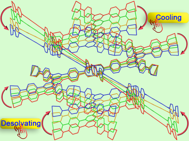 单元、具有双重刺激响应性能的FMOFs材料(FJI-H11-R, R = Me, Et, iPr),这些FMOFs材料能够可逆地对外界温度和溶剂分子等刺激产生不同程度的响应行为。研究结果表明,当温度从100 K升高到293 K的过程中,FJI-H11-R的晶体学c轴和晶胞体积表现出一种显著的正热膨胀行为。其中,FJI-H11-Me的c轴热膨胀系数高达653.2×10-6 K-1,是目前已报道的晶态材料中的最高值。此外,在失溶剂过程中,FJI-H11-Et的c轴发生了32.4%的收缩。当应对不同溶剂的蒸汽刺激时,收缩后的FJI-H11-R可以膨胀复原。其中,应对DEF刺激时,FJI-H11-Et的c轴膨胀系数高达70.8%,这在固态材料特别是单晶材料中是非常罕见的。更为重要的是,可以通过X-射线单晶衍射技术对上述外界刺激的响应过程的中间态进行可视化的捕获。通过对上述刺激响应过程中间态单晶结构的分析表明,FJI-H11-R主要是通过配体的旋转和扭曲诱导结构的变化,从而对外界的刺激予以响应。上述研究成果在线发表在《德国应用化学》上(Angew. Chem. Int. Ed., DOI: 10.1002/anie.201603030),该工作将对“智能材料”的设计合成起到很好的指导作用。