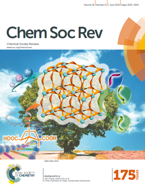 近年来,樟脑酸作为一种经济的光学纯羧酸配体,被广泛应用于构筑单一手性金属有机框架材料。在科技部973计划、国家基金委“无机-有机杂化功能材料”创新群体和国家杰出青年基金资助下,中国科学院福建物质结构研究所结构化学国家重点实验室张健研究员领导的无机合成化学团队受邀在《化学会评论》发表了题为 “Chiral Chemistry of Metal Camphorate Frameworks” 的综述论文 (Chem. Soc. Rev., 2016, 45, 3122-3144. Inside Front Cover)),并被选为内封面。该文系统综述了基于樟脑酸配体的单一手性金属有机框架合成策略,总结了手性金属樟脑酸框架结构的多样性,讨论了手性配体和手性环境在结构组装和结构诱导中所呈现出的手性化学特征,并举例介绍了手性金属樟脑酸框架材料在手性分离与识别中的应用研究。该文不仅为金属樟脑酸框架材料的设计合成与应用探索奠定了基础,也为其它单一手性金属有机框架材料的发展提供了设计方法和合成策略。
