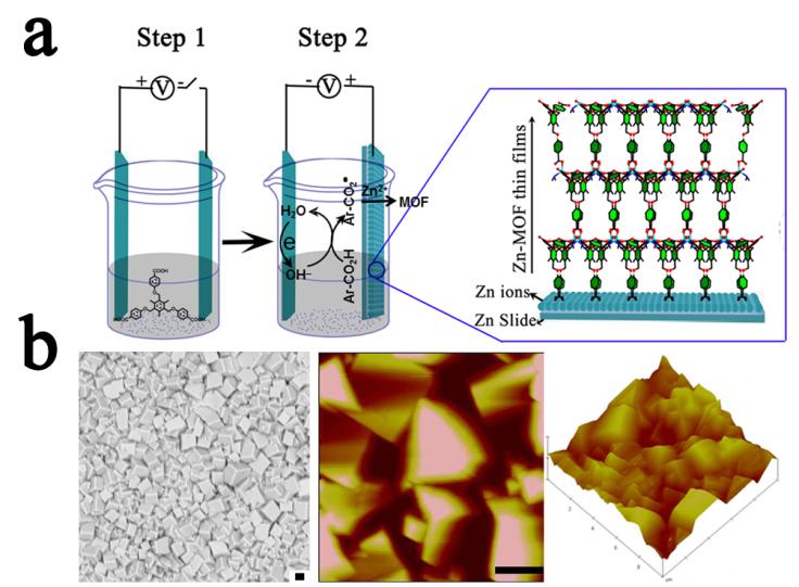 此前,该研究团队利用原位生长方法构筑金属-有机框架薄膜,探索了薄膜的传感与传输性能(Langmuir, 2013, 29, 8657)、抗菌性能(Adv. Mater. Interface, 2014, 2, 1400405),采用电化学方法成功制备了金属-有机框架薄膜,并探索其在传感方面的应用(J. Mater. Chem. A, 2014, 2, 19473);同时,采用电化学辅助微波合成法,优化了电化学生长方法,成功制备了镧系金属-有机框架薄膜(Chem. Commun., 2016, 52, 3951),拓展了金属-有机框架薄膜的制备方法和开发了金属-有机框架膜的潜在应用。