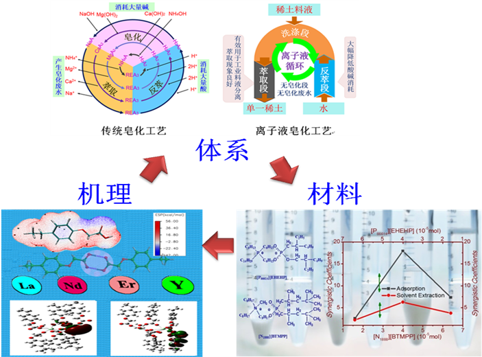 离子型矿是我国重要的稀土资源,其重稀土配分高达30-80%,是具有绝对竞争优势的战略资源。在国家自然科学基金和福建省科技重大专项的支持下,中科院海西院厦门稀土材料研究所孙晓琦团队面向清洁、高效离子型稀土矿冶金工艺研发的需要,在稀土分离机理、体系、材料的研究领域取得了新进展。
