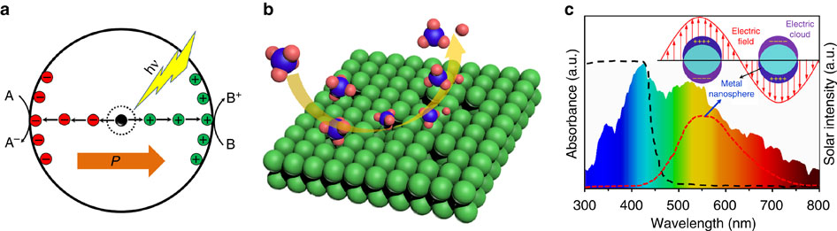 在科技部973计划和国家自然科学基金等项目资助下,福建物构所中科院功能纳米结构设计与组装重点实验室易志国研究团队采用光催化方法,利用氧化锌极性半导体的内嵌电场促进光生电子与空穴的分离,结合纳米氧化锌表面缺陷调控和纳米银的等离子体共振效应(见下图),实现了温和条件下甲烷的高效氧化:紫外光(<400nm)量子效率接近8%,可见光(~470nm)量子效率超过0.1%。所发展的催化材料不仅可在有氧条件下高效氧化甲烷等小分子碳氢,还可以实现甲烷的无氧转化。借助红外和电子顺磁共振等原位谱学表征手段,该团队深入分析了甲烷催化氧化的过程并提出了一种基于两步光氧化的反应机制。相关成果已发表在Nature Communications. 2016, DOI:10.1038/ncomms12273。