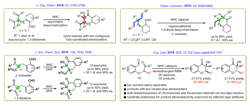 该课题组将不对称去对称化策略成功引入到分子内benzoin反应中,实现了具有连续两个季碳立体中心的环酮类分子的快速高效合成(J. Org. Chem.2016, 81, 2763-2769);随后,不对称去对称化策略与Stetter反应的结合实现了有机催化的1,4-双烯的去对称化(Chem. Commun.2016, 52, 6459-6462)。在此工作基础上,动态动力学拆分策略被首次应用于分子内benzoin反应中,实现了β-酮酯和1,3-二酮类底物的高效和高选择性拆分(J. Am. Chem. Soc.2016, 138, 7932-7938);此外,这一工作对benzoin反应机理方面的研究也取得了较大突破:传统观点认为分子内aldol反应会极大干扰benzoin反应的发生而造成产率降低,并且需要使用含有缺电子取代基的催化剂来降低aldol反应的发生;在本工作中,研究人员发现巧妙利用aldol反应的可逆性和benzoin反应不可逆的特点可以大大减少aldol类副产物的产生,并且缺电子取代基催化剂的作用被证明为加速benzoin反应的进行,而不是传统观点所认为的减少aldol产物的生成。最近,该课题组又成功地将立体多样性消旋混合物拆分策略首次引入到分子内benzoin反应中(Org. Lett. 2016, DOI: 10.1021/acs.orglett.6b01767),成功实现了色满酮和黄烷酮这两类具有多种药物活性(杀菌、抗炎、抗肿瘤、抗HIV病毒、抗诱变、抗氧化等)分子的顺反异构体的一步高效简洁合成,这一工作在药物研发方面也具有很好的应用前景。