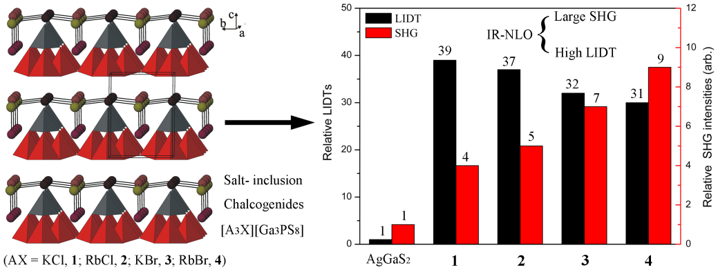 在中科院战略性先导科技专项、国家自然科学基金等项目的资助下,福建物构所结构化学国家重点实验室郭国聪研究员领导的研究团队为了克服大NLO系数及高激光损伤阈值难以同时兼得的结构设计瓶颈,创新性提出双“功能基元”的结构设计思路,即把“抗激光损伤功能基元”(即由电负性差异大的元素构建聚阳离子基团以增加带隙进而提高激光损伤阈值)和“NLO活性功能基元”(即由畸变四面体结构单元构建成超四面体结构进而增大NLO系数)在分子水平上组装成无心结构的思路,成功合成了高性能的红外NLO新材料体系[A3X][Ga3PS8] (A = K, Rb; X = Cl, Br),这些化合物具有高的NLO系数(4~9AgGaS2)及高的粉末激光损伤阈值(31~39AgGaS2),突破了高NLO系数和高激光损伤阈值难兼得的瓶颈;值得指出的是,在已报道的NLO系数高于AgGaS2的材料中,这些化合物的激光损伤阈值是目前最高的。同时,化合物具有宽的红外透过范围及满足相位匹配,是潜在的高功率红外NLO晶体材料。相关的研究工作申请了中国发明专利(201610316492.4),并以《[A3X][Ga3PS8] (A =K, Rb; X =Cl, Br): promising IR non-linear optical materials exhibiting concurrently strong second-harmonic generation and high laser induced damage thresholds》为题,发表在Chem. Sci.2016,7, 6273-6277. DOI: 10.1039/C6SC01907B。