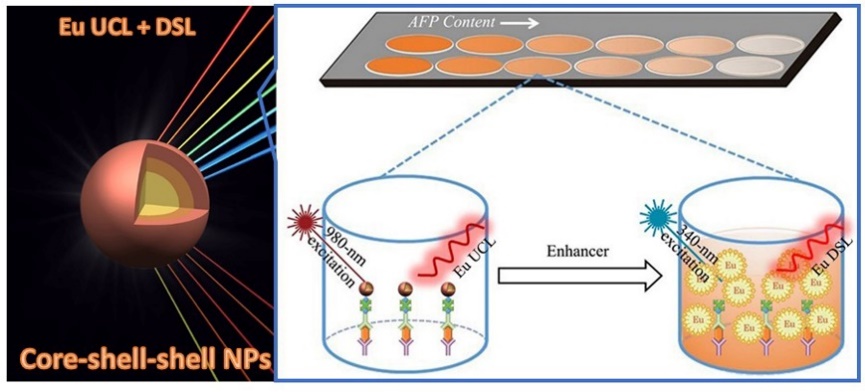 (基于Eu3+双模发光的核-壳-壳结构纳米荧光探针实现AFP高灵敏体外检测示意图)
