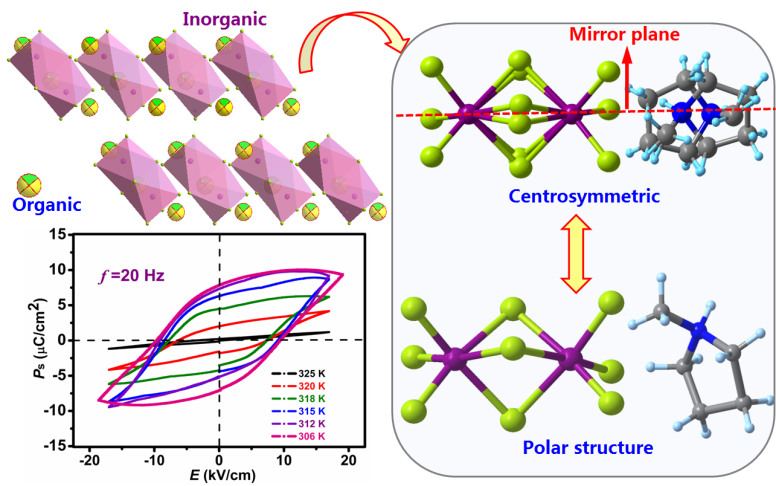 中国科学院福建物质结构研究所结构化学国家重点实验室和中科院光电材料化学与物理重点实验室研究员罗军华领导的无机光电功能晶体材料研究团队在国家杰出青年基金、中科院战略性先导科技专项研究员孙志华主持的中科院海西研究院“春苗人才”专项和福建省杰出青年基金等项目资助下,基于固体相变诱导极化效应的策略,构筑了一例具有类钙钛矿结构的极性化合物。在该晶体材料的结构组成中,无机金属骨架沿着<111>方向表现出零维的类钙钛矿结构,相变过程中发生了构型扭曲;有机阳离子则产生无序-有序的结构变化,两者之间相互协同诱导材料产生强的自发极化效应。利用外加电场作用,该材料的自发极化可以发生翻转,表现出明显的铁电性能;进一步研究还发现该化合物表现出温度依赖的电导率和光电导等半导体性能。相关研究结果发表在《德国应用化学》(Angew. Chem., Int. Ed. 2016, DOI:10.1002/anie.201606079)。作为一例铁电半导体材料,该极性化合物的成功制备将拓展无机-有机杂化材料在太阳能电池、光电探测等方面的潜在应用。此前该研究团队基于固体相变对称性破缺诱导极化效应的设计策略,构筑了一例无机有机杂化铁电光伏晶体材料(Angew. Chem., Int. Ed., 2016, 55, 6545)。