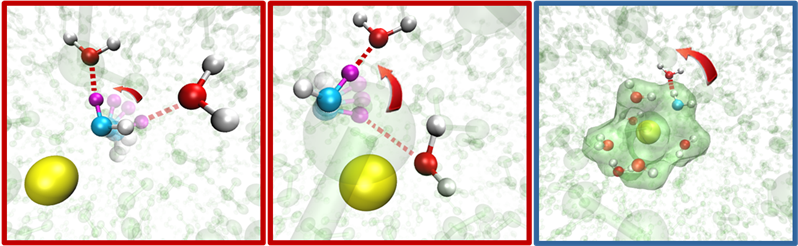 在对溶液离子效应的研究中有一个极具争议的基本问题,即如何理解阳离子对水分子动力学行为的影响。对于这一问题,各种不同的实验手段往往给出不同的图像。例如,对于Na+和K+这两种极其相似的碱金属离子,中子散射实验测量到它们对水具有类似的结构破坏作用,因而认为它们都会使水的转动运动加快;而核磁共振与超快激光光谱动力学实验则检测到Na+会减慢,而K+会加速水分子旋转。对这一问题的深刻理解由于这两种碱金属离子在能源、电化学和生命科学中的显著作用而变得尤为重要。