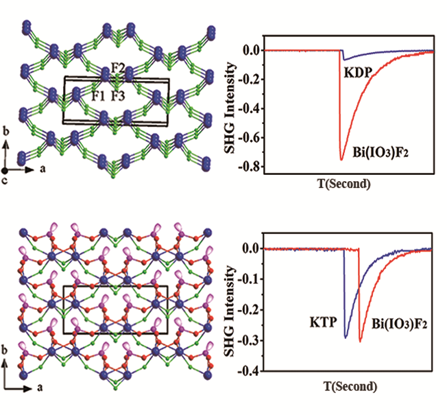 福建物构所结构化学国家重点实验室毛江高研究员领导的课题组在国家基金委重点和面上项目、重大研究计划培育项目以及中科院战略性先导科技专项等的资助下,提出将氟离子引入碘酸盐体系,构筑新颖结构的金属碘酸盐氟化物,利用金属氟化物三维结构来限制碘酸根离子的排列方向,使各个碘酸根离子的极化作用相互叠加而表现出大的倍频系数。在这一学术思想指导下,该课题组以水热合成方法,得到了首例碘酸盐氟化物Bi(IO3)F2晶体,其结构中碘酸根离子整齐排列于三维[BiF2]+离子的六元环孔洞中。该化合物表现出非常高的倍频效应,为KDP(KH2PO4)的11.5倍,而且是相位匹配的,同时具有较宽的透过波段(0.3-11 μm),因此是一种具有潜在应用价值的二阶非线性光学晶体材料。理论计算表明IO3和[BiF2]+基团对d14的贡献百分比分别为77.1%和21.8%,相关研究结果作为VIP论文在线发表于Angew. Chem. Int. Ed.上(DOI: 10.1002/anie.201611770),该工作为今后新型碘酸盐二阶非线性光学晶体材料的设计提供了一条新的合成策略。