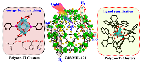 福建物构所结构化学国家重点实验室张健研究员和张磊研究员领导的无机合成化学团队从反应机理出发,有目的地设计了一系列基于钛氧团簇的复合光催化材料体系。通过溶剂热反应,分步将硫化镉纳米颗粒与钛氧团簇原位自组装到多孔框架材料MIL-101中,得到具有良好可见光吸收的三元复合材料。同时,归功于三组分之间的协同效应,在没有贵金属作为助催化剂的条件下,其光解水产氢效率相较CdS/MIL-101二元材料有了大幅度提高。更有意思的是,通过改变钛氧团簇上修饰的有机配体的共轭特性,还可以进一步对这一三元材料体系的催化活性进行优化,最终将产氢速率提高近50倍。光谱和电化学分析表明,在此复合体系中,钛氧团簇可以作为电子转移媒介,将光生电子从硫化镉颗粒分散到多孔材料表面,从而促进电荷-空穴分离,提高催化活性。这项研究成果不仅建立了基于钛氧团簇的高效可见光驱动产氢催化体系,同时也从分子层面提供了调控并优化其催化活性的有效工具。相关成果已发表于Adv. Mater. 2017, 29, 1603369。