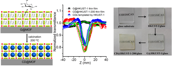 最近,福建物构所结构化学国家重点实验室张健研究员领导的研究团队成功合成了负载超小碳纳米点阵的光学MOF薄膜材料。碳纳米点(CDs)由于其高化学稳定性、低毒性、良好的生物兼容性和优异的光物理性能,在催化、荧光、传感、和生物成像等方面都有着广泛的应用前景。该研究团队创新性地利用了MOF材料和葡萄糖分子在碳化温度上的显著差异,去实现碳纳米点与MOF材料的复合。一般MOF材料的碳化温度需超过500摄氏度,而葡萄糖分子的碳化温度却在200摄氏度左右。因此,负载葡萄糖分子的MOF材料在200摄氏度下保持骨架结构不变,但是葡萄糖被碳化为限制在MOF孔中的碳纳米点,从而获得分散均一的CDs@MOF复合材料。碳纳米点的尺寸可以通过选择拥有不同孔结构的MOFs去调控。制备的碳纳米点负载型MOF薄膜不仅具有良好的形貌和光学透明度,而且表现出波段可调的光致发光效应和光限幅效应。该研究工作实现了超小碳纳米点阵在MOF模板中的可控合成,并发展了新型CDs@MOF复合光限幅材料,发表于Angew. Chem. Int. Ed. (2017, DOI: 10.1002/anie.201702162)。