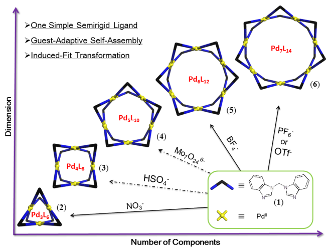 福建物构所结构化学国家重点实验室孙庆福研究员及其团队在具有多种阴离子响应性键合的自适性配位自组装研究领域取得突破。研究发现:半刚性双苯并咪唑桥连配体(1)与具有平面四方配位构型的钯离子在不同阴离子存在条件下可以自组装得到5种不同尺寸的PdnL2n (n = 3, 4, 5, 6, 7)型的金属有机大环受体,并通过NMR、ESI-MS、X射线衍射等手段对其进行了结构确认。晶体结构解析证明,大环内表面的咪唑氢原子与阴离子形成多重氢键作用,并对最终的自组装结构起了模板作用。同时,多级串联阴离子滴定实验总结了基于阴离子构型和尺寸的诱导匹配原理的各个多元环受体之间相互转化规律,并揭示了在NO3-诱导七元环转化三元环的过程中存在六、五、四元环中间体的存在。基于以上发现,作者提出了阴离子客体和金属有机大环之间的氢键作用推动的诱导匹配自适应转化机理。该工作为新型阴离子受体的结构设计提供了一条新思路。上述研究工作发表在Nat. Commun. 2017, 8, 15898. DOI: 10.1038/ncomms15898。