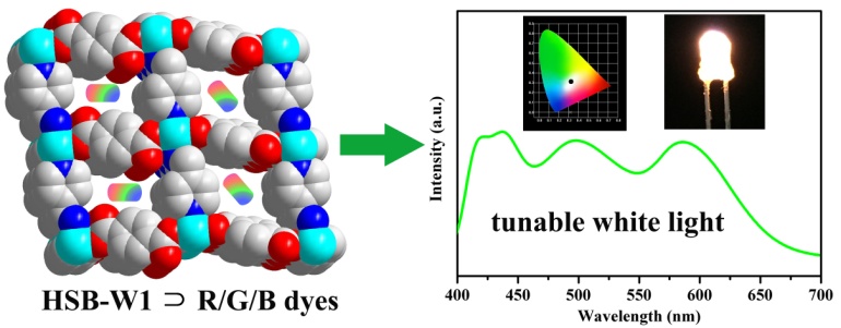 在国家自然科学基金、中科院战略性先导科技专项、科技部973计划、等基金的资助下,福建物构所吴新涛院士和朱起龙研究员团队的温跃红副研究员设计合成出一类新颖的三维MOF,即HSB-W1(HSB = hydrogenated Schiff base),该MOF具有较高的孔隙率和大的孔道尺寸。研究表明,离子型或中性的有机染料客体分子(如荧光增白剂、香豆素类、DSM和DCM等)都能轻易地引入到HSB-W1中,分别得到蓝、绿、红色发光的荧光复合材料。进一步研究发现,HSB-W1中可同时引入红/绿/蓝三种客体染料分子,通过调节它们的含量以及种类,制备出了许多高品质的单相白光复合材料(量子产率和显色指数高达26%和92)。该研究首次在MOF中同时引入红/绿/蓝光三基色发射的客体分子,使得产生的白光更具可调性,进而可系统优化白光的各项指标;同时,创新性地在MOFs主体中引入发蓝光客体分子,不仅扩展了适用的MOFs主体范围,并且提高了材料的白光发射性能。该MOFs白光材料的设计合成方法具有很强的普适性,可用于其它优越的单相白光复合材料的制备。上述研究成果发表在Adv. Mater. 2017, DOI: 10.1002/adma.201700778。