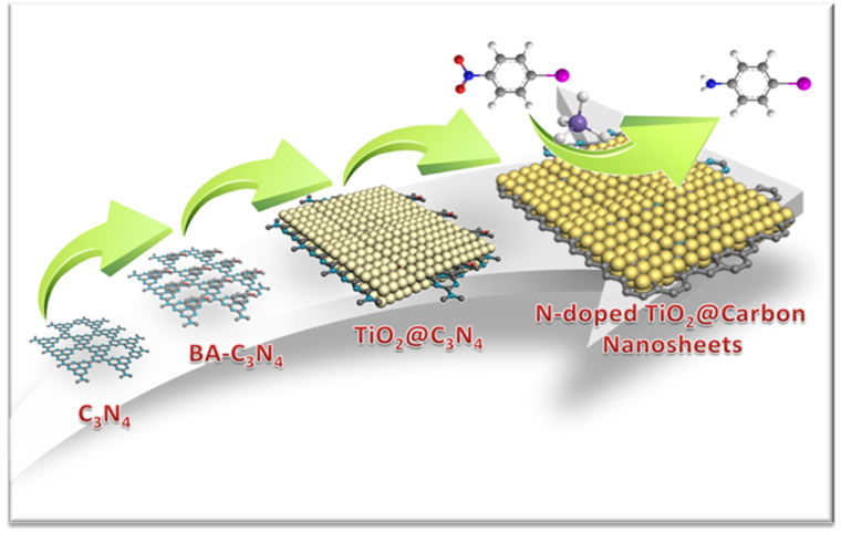 在科技部973计划和国家自然科学基金等项目资助下,福建物构所中科院功能纳米结构设计与组装重点实验室易志国研究团队潘晓阳博士利用氮化碳作为多功能模板,通过对二氧化钛的晶相、形貌和缺陷结构的原位调控,实现了将廉价易得、稳定性高但却无催化活性的二氧化钛转变为具有高室温硝基加氢活性的氮掺杂、富缺陷的二氧化钛-碳复合纳米片。其室温选择性硝基加氢活性不仅可媲美负载型金纳米催化剂,而且具有更为优异的稳定性。结合电子自旋共振分析以及一系列的控制实验,该团队深入分析了硝基还原的过程并提出了一种基于缺陷和掺杂原子的反应机制。相关成果已发表在ACS Catalysis, 2017, 7 (10), pp 6991–6998。