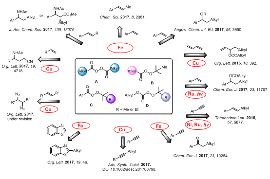 该团队致力于研究各种过氧化物,并探究其在不同化学环境下的不同表现行为,主要包括:(1)过氧化物的反应模式;(2)烷基过氧化物同时作烷基化试剂和内氧化剂;(3)过氧化物可参与的新反应;(4)非天然氨基酸的合成。目前已系统性地研究了不同反应条件下烷基过氧化物的活性及活化模式,发现烷基过氧化物可同时作为烷基化试剂和内氧化剂,这种双效性使得烷基过氧化物能够驱动其他亲电试剂(如:烷基卤代物)不能驱动的新反应。相关工作如下图所示: