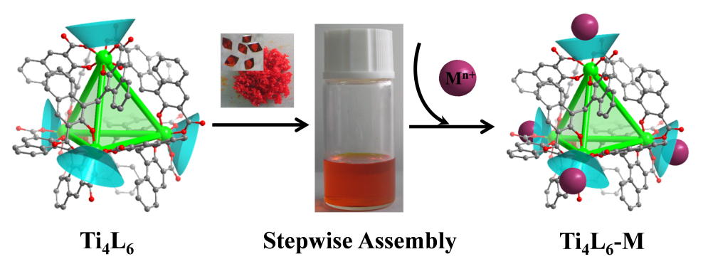 金属-有机配位多面体是近年来无机化学和超分子化学研究的重点领域,在催化、发光、识别与分离等领域都有广泛应用。虽然具有各种结构和应用的配位多面体已经被大量报道,但大家更多关注于这些孤立结构本身的构筑,而对它们的进一步组装研究相对较少。此外,目前已知的配位多面体大多是基于Pd,Pt,稀土等资源稀缺金属离子,而基于资源丰富的钛离子的配位多面体相对非常少。而且,考虑到含钛材料优异的光催化活性,基于钛的配位多面体也将具有非常好的光催化应用。