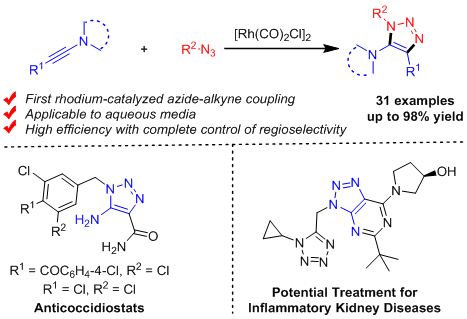在国家自然科学基金、中国科学院先导专项等基金的支持下,福建物构所中科院煤制乙二醇及相关技术重点实验室黄学良研究员课题组与结构化学国家重点实验室李春森研究员课题组合作下发展了一种铑催化叠氮化物与炔酰胺的Click反应。该反应条件温和、无需惰性气体保护,可以在水相完成克级反应、无副产物生成、兼容多种敏感官能团,最终以高收率实现了多种全取代5-氨基三唑化物的合成,在区域选择行上实现了完全控制。李春森研究团队的卢倩倩博士通过理论计算对反应的区域选择性进行了详细的研究。