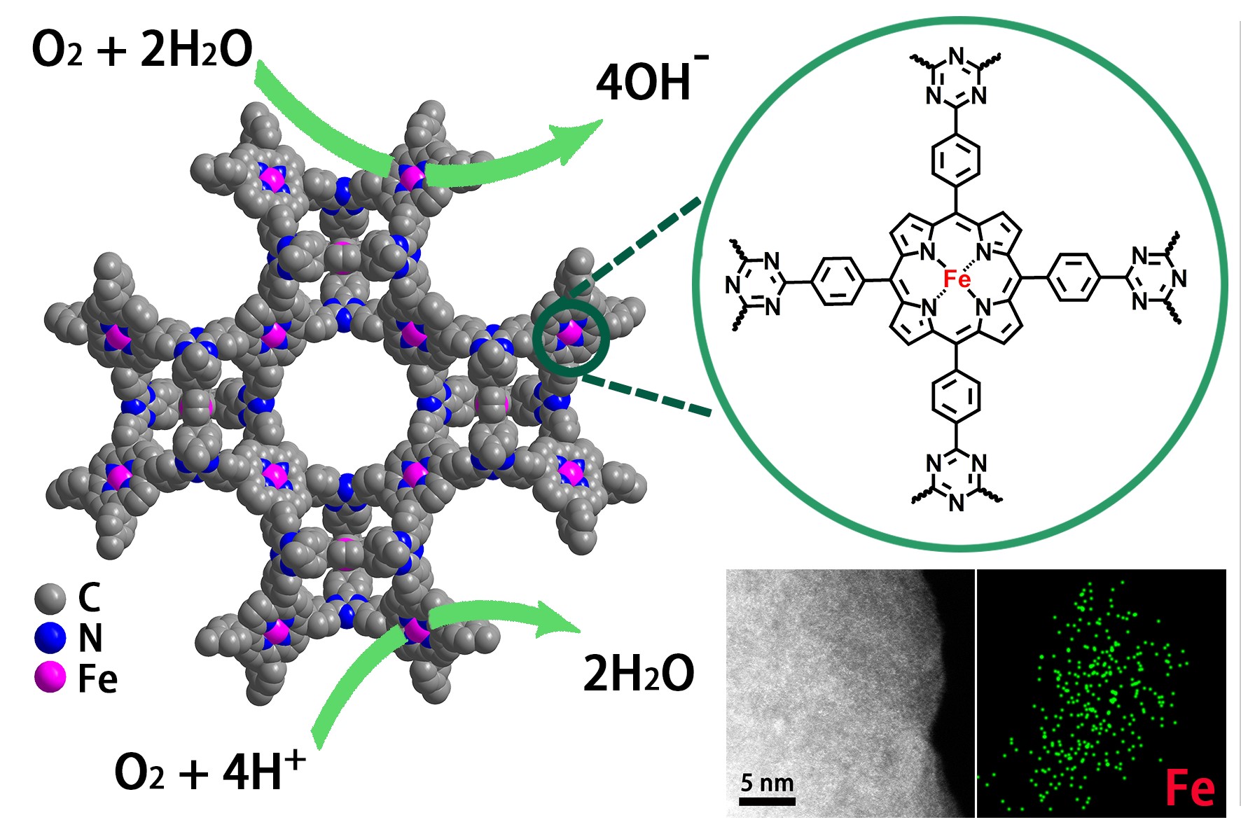 中科院福建物构所结构化学国家重点实验室曹荣和黄远标团队在科技部重点研发计划、国家自然科学基金项目、中科院战略性先导科技专项、前沿科学重点研究项目资助下,利用嗪基卟啉铁作为单体,成功通过离子热法,一步合成获得了固载在多孔卟啉基共价三嗪框架材料上的单原子Fe-N4催化剂。球差电镜中没有观察到铁纳米颗粒,Fe原子呈现原子级别分布;扩展X射线吸收精细结构(EXAFS)表明每个铁原子周围配位四个氮原子形成稳定的Fe-N4结构,因此该单原子催化剂在酸、碱性条件下ORR活性优于市售铂碳催化剂(20%Pt/C),同时具有更高的稳定性和更好的抗甲醇中毒能力。