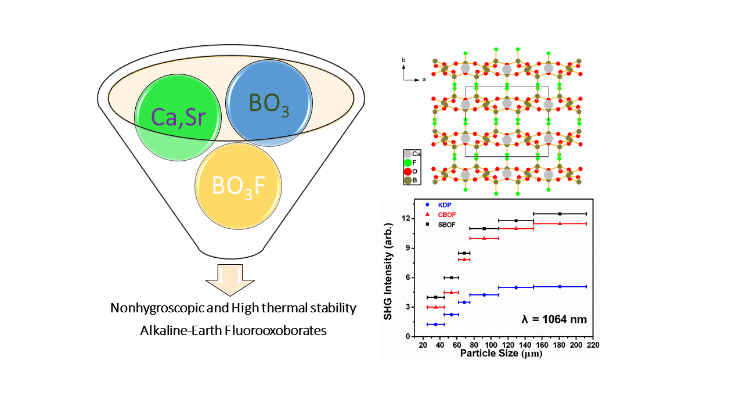 福建物构所中科院光电材料化学与物理重点实验室叶宁课题组在国家杰出青年基金、中科院战略性先导科技专项和罗敏助理研究员主持的海西研究院“春苗”人才专项等项目资助下,成功将碱土金属阳离子引入到氟硼酸盐体系中,合成出首例非心的碱土金属氟硼酸盐M2B10O14F6 (M=Ca, Sr)晶体。实验表明,该系列晶体具有良好的物化性能,较大的倍频效应(2.3-2.5×KDP)和短的紫外截止边(<200 nm),理论预测的最短相位匹配波长可达到169 nm (Sr2B10O14F6)和171 nm (Ca2B10O14F6),是非常有前景的深紫外非线性光学晶体。该成果以通讯文章发表在《美国化学会志》(J. Am. Chem. Soc.,2018, 3884-3887)。