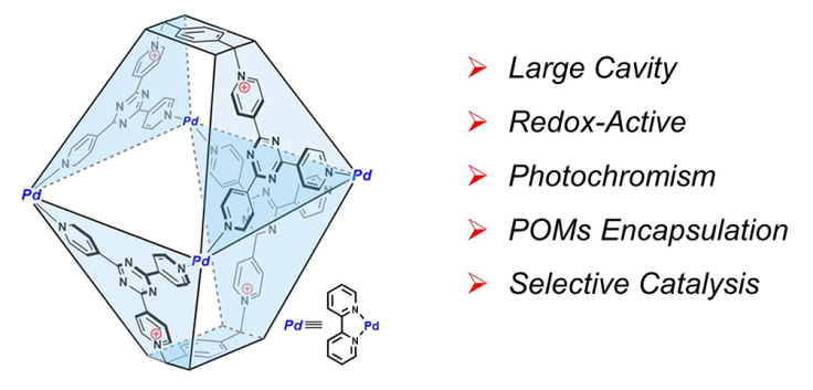 水溶性功能配位超分子纳米容器的设计合成及其限域空间内独特的客体分子行为与反应性在过去二十年里受到了越来越广泛的关注。目前报道的水溶性超分子纳米容器组装结构有限,并且大都存在表面窗口太小、内部空腔不足、不易功能化等问题,很大程度上限制了其在主客体化学方面的应用。如何从分子水平上定向构筑和调控纳米容器的尺寸、形状及其电子特性是实现其功能化应用的关键科学问题。