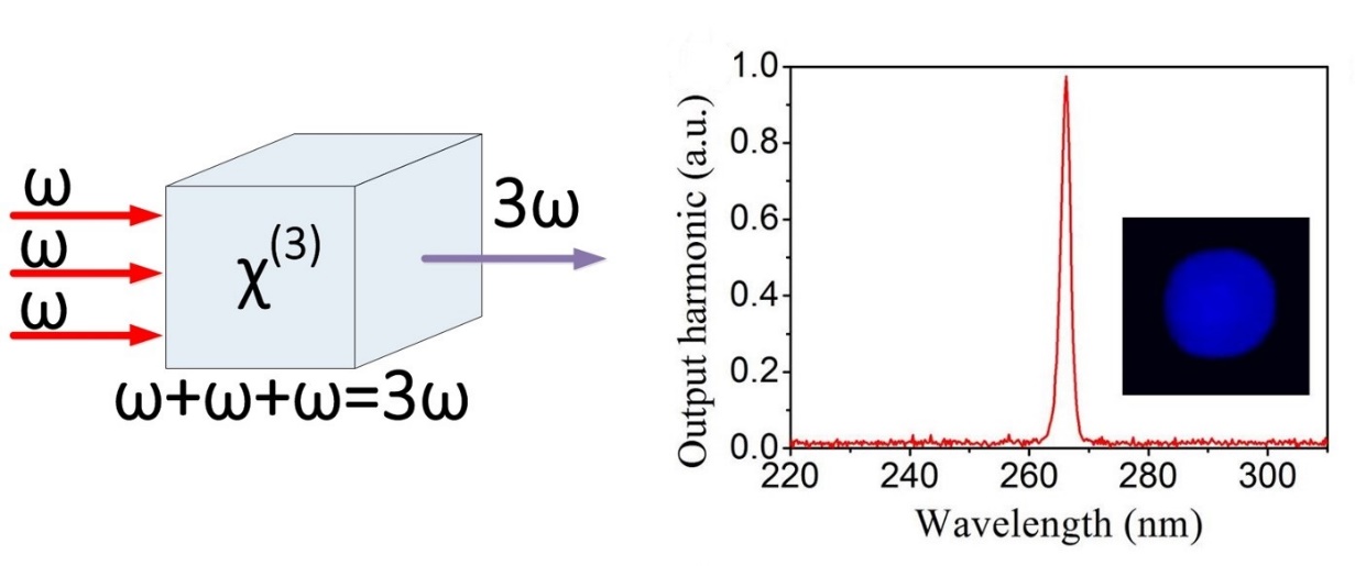 利用级联的二阶非线性频率转换(两次倍频或一次倍频加一次和频)是获得紫外波段激光的常用方法。二阶非线性光学过程只能产生于非中心对称的晶体中,而三阶非线性光学过程不受晶体对称性的限制,可以产生于中心对称的晶体中,同时利用三阶效应一次产生紫外激光输出,能有效简化器件结构。但由于大多数晶体的三阶非线性光学极化率非常小,因此迄今转换效率很低低,更未见短波紫外三次谐波产生的报道。