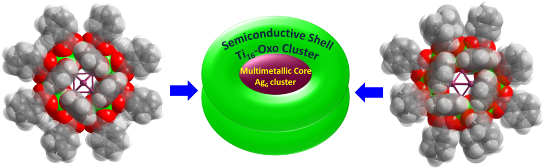 金属及半导体纳米粒子由于具有独特的光、电、磁或催化性能,受到化学、材料领域的广泛关注。近年来,为了更好地理解这些材料的作用机制和构效关系规律,作为其分子模型的贵金属团簇和半导体团簇吸引了越来越多的研究兴趣。另一方面,二氧化钛负载贵金属催化剂在实验室和工业生产中已经得到广泛应用,所以如果能将贵金属团簇与钛氧簇进行复合,不仅可以得到新颖的杂化团簇,更可以为上述异相催化材料提供分子模型,从原子尺度直接理解重要的金属-载体相互作用。