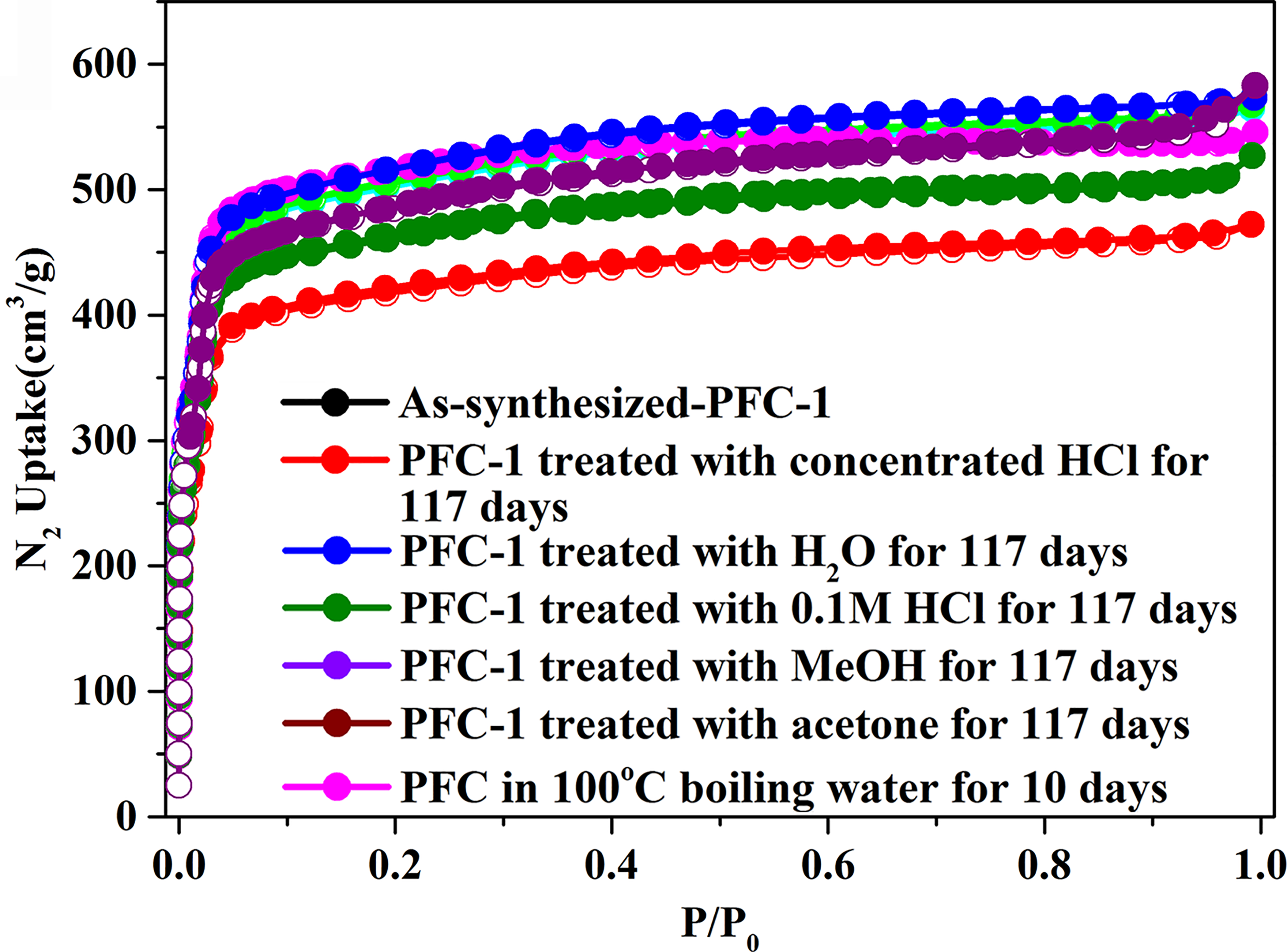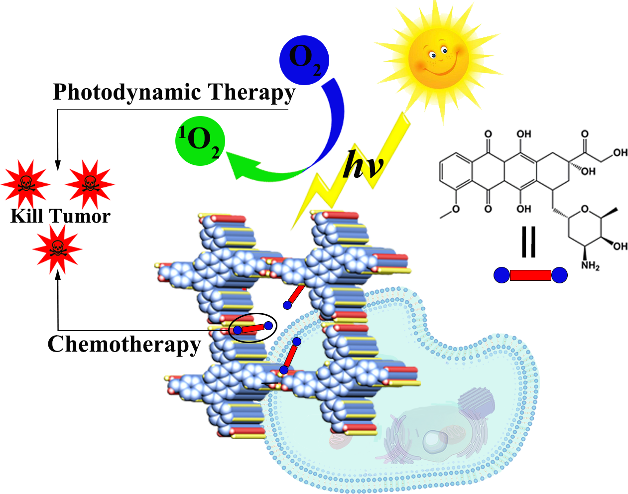 在国家自然科学基金项目、中科院战略性先导科技专项、前沿科学重点研究项目的资助下,福建物构所结构化学国家重点实验室曹荣课题组和刘天赋课题组合作,通过多重氢键、强π-π相互作用、避免骨架中出现独立的氢键给受体的多重策略,以四羧酸芘(H4TBAPy)为单体,设计合成了一例具有高比表面积、优异的化学和热稳定性以及易再生性的HOF材料。该材料BET比表面积高达2122 m2·g-1,且在浓盐酸中浸泡117天依然保持其骨架的完整性,HOF材料在酸性条件下自恢复的特性被首次发现;同时鉴于该HOF材料无金属、低生物毒性、可产生单线态氧的特点,在首次实现HOF材料尺寸的可控调节的基础上,于材料孔道中引入了抗癌药物阿霉素,该材料在原位细胞实验中成功实现了对癌症的化学光动力学协同治疗,相关结果发表在Angew. Chem. Int. Ed., 2018, 57, 7691-7696上。
