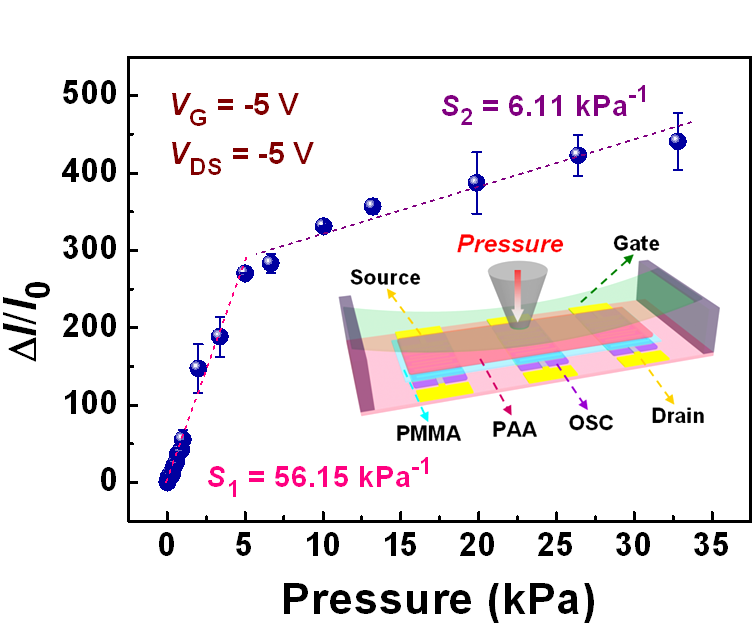 有机场效应晶体管(OFET)是一类信号转换和信号放大功能优异的电子元器件,具有成本低、质量轻、柔性可折叠、可溶液加工等优点,在智能传感、生物医学检测、集成电路等领域具有广泛的应用前景。当前,如何实现低电压、低功耗的柔性高灵敏OFET压力传感器,对于发展人工电子皮肤、可穿戴设备等柔性电子器件具有重要意义。