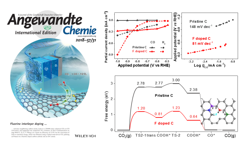 左图:文章被选为德国应用化学内封面;右图:氟掺杂提高碳材料催化CO2转化性能