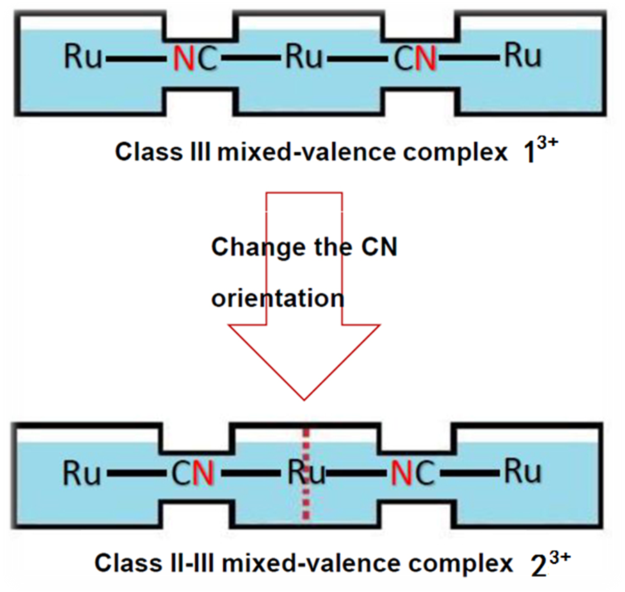 在中科院战略性先导科技专项、973项目和国家自然科学基金的资助下,中国科学院福建物质结构研究所、结构化学国家重点实验室吴新涛院士研究组在前期混合价化合物研究的基础上最近合成得到合成得到不同氧化态能稳定存在的含氰桥/异氰桥三核钌化合物[Cp*(dppe)RuNCRu(dmpy)4CNRu(dppe)Cp*]n+ (1n+, n = 2, 3)和 [Cp*(dppe)RuNCRu- (dmpy)4NCRu(dppe)Cp*] n+ (2n+, n = 2, 3) ,并经包括单晶结构在内的完全表征。研究表明,化合物13+(RuIII-NC-RuII-CN-RuII)为完全电子离域(Class III)混合价化合物。通过改变化合物13+中氰桥配体的取向,合成得到的混合价化合物23+(RuII-CN- RuIII-NC-RuII)则表现为不完全电子离域,即Class II-III混合价化合物。这是首例通过改变氰桥配体取向实现多核氰桥混合价化合物由完全电子离域(Class III)向不完全电子离域(Class II-III)转变。
