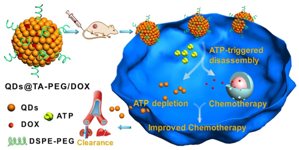 在国家自然科学基金杰出青年科学基金、科技部973计划、中科院战略性先导科技专项和创新国际团队等项目支持下,福建物构所中科院功能纳米结构设计与组装重点实验室陈学元研究小组和福州大学食品安全与生物分析教育部重点实验室杨黄浩研究小组合作,支持“率先行动”联合资助优秀博士后项目获得者宋晓荣博士等利用核壳结构CdSe@ZnS荧光量子点和植物多酚丹宁酸的自组装构建了一种新型智能量子点组装体,并通过负载化疗药物实现了肿瘤的高效治疗。该智能纳米组装体显示了优异的生物相容性,同时展示了三磷酸腺苷(ATP)特异性响应的解组装性能,并可以利用解组装后量子点的荧光增强信号实现对解组装过程的监控。由于肿瘤细胞的无限增殖和大量糖酵解过程,肿瘤细胞内的ATP水平比正常细胞高出约10倍。研究人员进一步将化疗药物阿霉素负载到智能组装体中,并基于此智能纳米药物实现了肿瘤细胞特异性的药物递送。特别地,该智能纳米药物能够引起细胞内ATP水平的降低,并激发肿瘤细胞的化疗增敏性,从而大大提高肿瘤细胞的化疗效果。最后,研究人员在小鼠肿瘤模型上证实了智能纳米药物能够完全抑制小鼠肿瘤的生长或消除肿瘤,并且由于组装体在解组装后能够有效地从肝、肾等组织排出机体,治疗组小鼠没有发生任何副作用。该研究结果不仅发展了一种简单构建生物相容性良好的智能纳米药物递送系统的方法,同时利用肿瘤特异性的药物递送和肿瘤的化疗增敏实现了机体无副作用的肿瘤高效治疗。该工作将为智能纳米药物递送系统的开发提供新的思路,并将加快肿瘤的高效诊疗研究。相关结果2018年10月26日在线发表于《先进科学》(Adv. Sci. 2018, 1801201. DOI: 10.1002/advs.201801201)。