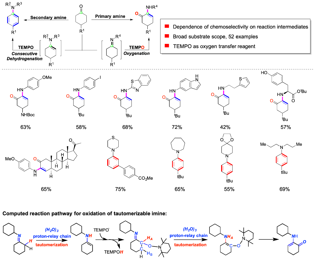 亚胺(Imines)与烯胺(Enamines)为合成化学中的重要中间体。带有α-H的亚胺因其可快速异构化为烯胺,长期以来,两者被认为具有类似的化学反应性。有趣的是,近期中国科学院福建物质结构研究所苏伟平课题组与庄巍课题组开展密切的科研协作,通过构建合适的模型反应,揭示了亚胺与烯胺间截然不同的化学选择性。研究表明,带有α-H的亚胺可与TEMPO发生氧转移反应选择性生成α-氨基烯酮;而不带α-H的烯胺则与TEMPO发生脱氢反应选择性生成芳构化产物。理论计算工作指出亚胺可通过与烯胺的互变异构生成活泼的N-H,进而影响反应的化学选择性。
