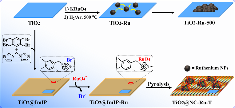 在国家自然科学基金(21603228, 21673241 和 21471151)和中科院战略性先导科技专项(XDB20000000)的资助下,中科院福建物构所结构化学国家重点实验室王瑞虎研究员课题组选用离子聚合物包裹的二氧化钛纳米片复合材料,通过离子交换技术将钌离子均匀分布在离子聚合物中,从而有效抑制高温焙烧过程中钌纳米粒子的团聚,原位得到小尺寸、高分散的超细金属纳米粒。同时,生成的氮掺杂碳不仅提高了催化剂的导电性,降低了肖特基能垒,促进了光生电子从激发态钌纳米粒向二氧化钛表面转移,还增强了反应底物分子的吸附和钌纳米粒的活性,使水介质中光催化醇氧化反应的活性提高了4倍以上。该催化材料具有极好的稳定性,多次循环使用后纳米粒的尺寸、分布和晶面等都没有发生明显变化。该研究有效解决了金属纳米粒在高温焙烧过程中团聚和分散的问题,为碳负载的超细纳米粒的合成提供了新途径。该论文第一作者为钟鸿助理研究员,相关研究成果已发表在Energy Environ. Sci. 2019, 12, 418-426。