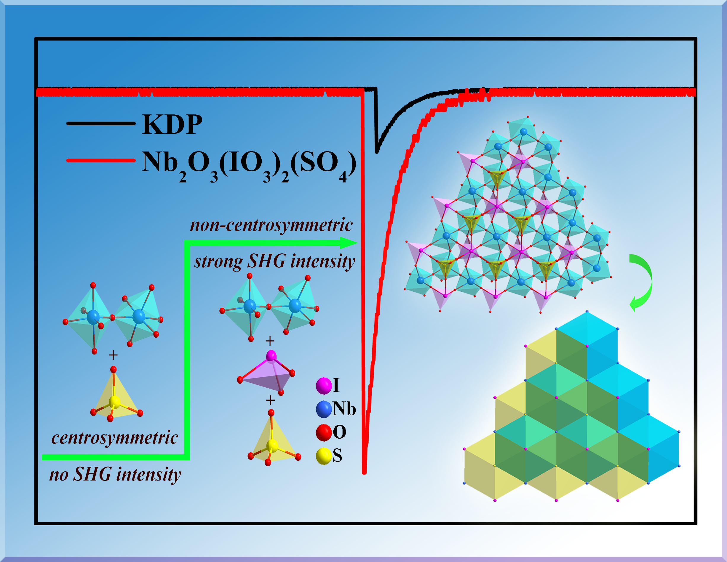 非线性光学材料在全固态激光器、医疗、通讯、精密制造、核聚变和国防军事等领域具有不可替代的作用,因此如何通过合理的设计合成新型高性能的非线性光学材料一直是该领域的研究热点和难点。通过引入易产生二阶姜泰勒效应的结构单元,可有效地获得非中心对称结构的化合物,这一策略被广泛用于合成新型的非线性光学材料。这些结构单元包括d0族过渡金属离子(Ti4+、V5+和Nb5+等)、含有孤对电子的阳离子(Pb2+、Sb3+、Bi3+、Se4+和I5+等),以及含有π共轭的体系(硼酸盐类等)。然而,不同元素具有不同的性质,在合成制备过程中也存在不同的问题和难点。例如,对于金属碘酸盐而言,通常在温和的酸性条件下制备,而铌在此条件下则非常稳定,这两者之间存在难以互相结合的难题。因此含铌金属碘酸盐的合成一直是该领域研究的难点。
