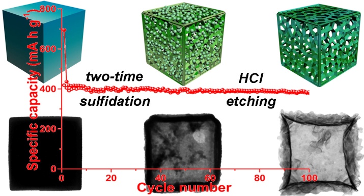 中国科学院福建物质结构研究所结构化学国家重点实验室张健研究员领导的无机合成化学团队与张华彬博士合作,在国家重点研发计划,国家自然科学基金,中科院战略性先导科技专项的资助下,采用二次硫化(溶剂热硫化和高温煅烧硫化)和酸刻蚀的策略,将锌、钼基的沸石型咪唑骨架(HZIF-Zn/Mo)转变为由钼缺陷丰富的超薄二硫化钼纳米片组装的中空的微立方体框架(HMF-MoS2)。作为钠离子电池负极材料,该材料表现出了较高的可逆容量、优异的倍率性能和循环稳定性。动力学分析结果表明HMF-MoS2的超快钠离子存储源于其自身电容性电荷存储。实验结果和理论计算表明,大量的钼缺陷可以有效提高二硫化钼的导电性,增强二硫化钼与钠离子的相互作用,从而提高HMF-MoS2的储钠性质。通过缺陷和形态学控制,该工作有助于从分子水平理解二硫化钼表面的电化学反应,为研究其他过渡金属硫化物在能源领域方面的应用提供了新的思路。上述工作发表在ACS Nano, 2019, DOI: 10.1021/acsnano.9b00383。文章的第一作者是在读博士研究生李扬。