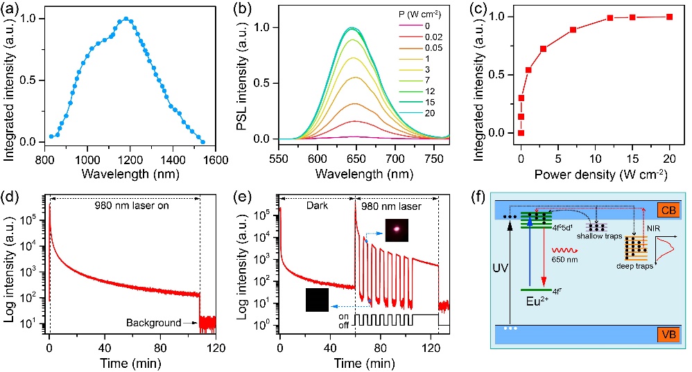 图2、CaS:Eu2+,Sm3+光激励纳米荧光标记材料: a) 光励激发光谱, b) 功率依赖发射光谱, c) 发光强度与功率依赖关系, d) 光激励荧光衰减曲线, e) 光激励荧光响应曲线, f) 发光机理示意图
